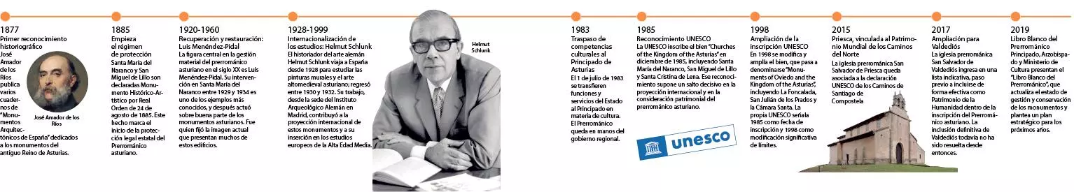 Botella medio llena o medio vacía, lo mejor que se puede decir después de haberse celebrado el 40 aniversario de la declaración de la UNESCO que ingresó al Prerrománico asturiano en el selecto club del Patrimonio Mundial, es que los edificios siguen en pie. «No es un momento malo, los monumentos se conservan y aunque hay todavía dificultades para interpretar su significado, no hay que preocuparse mucho por ellos. Todo lo demás está un poco a medias», resume el arquitecto Fernando Nanclares, que junto con Antón Capitel firmó en 2006 un Plan Director del Prerrománico que nunca llegó a aprobarse. El cumpleaños UNESCO de Santa María del Naranco, San Miguel de Lillo, Santa Cristina de Lena, Foncalada, San Julián de los Prados y la Cámara Santa -por citar en orden los bienes que estrictamente están reconocidos en el dossier 312bis de la organización de Naciones Unidas para la Cultura- tiene, efectivamente, cierto sabor agridulce. En los últimos años, coinciden los especialistas, se ha avanzado en casi todos los aspectos de conservación, gestión y difusión de este patrimonio pero, al tiempo, matizan muchas voces, ese avance ha sido tímido en recursos y objetivos.